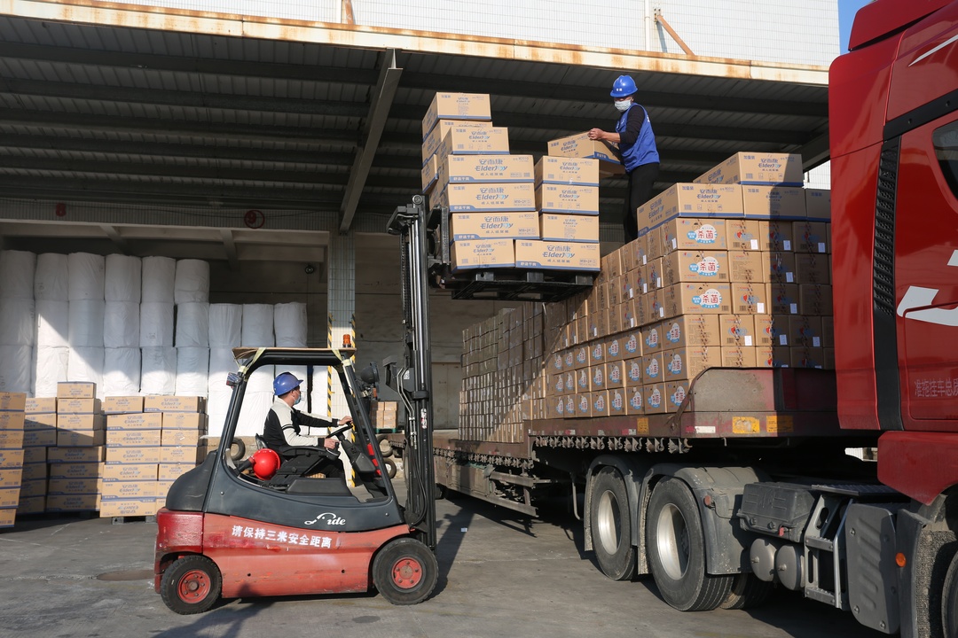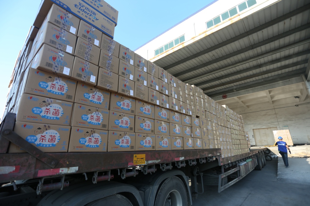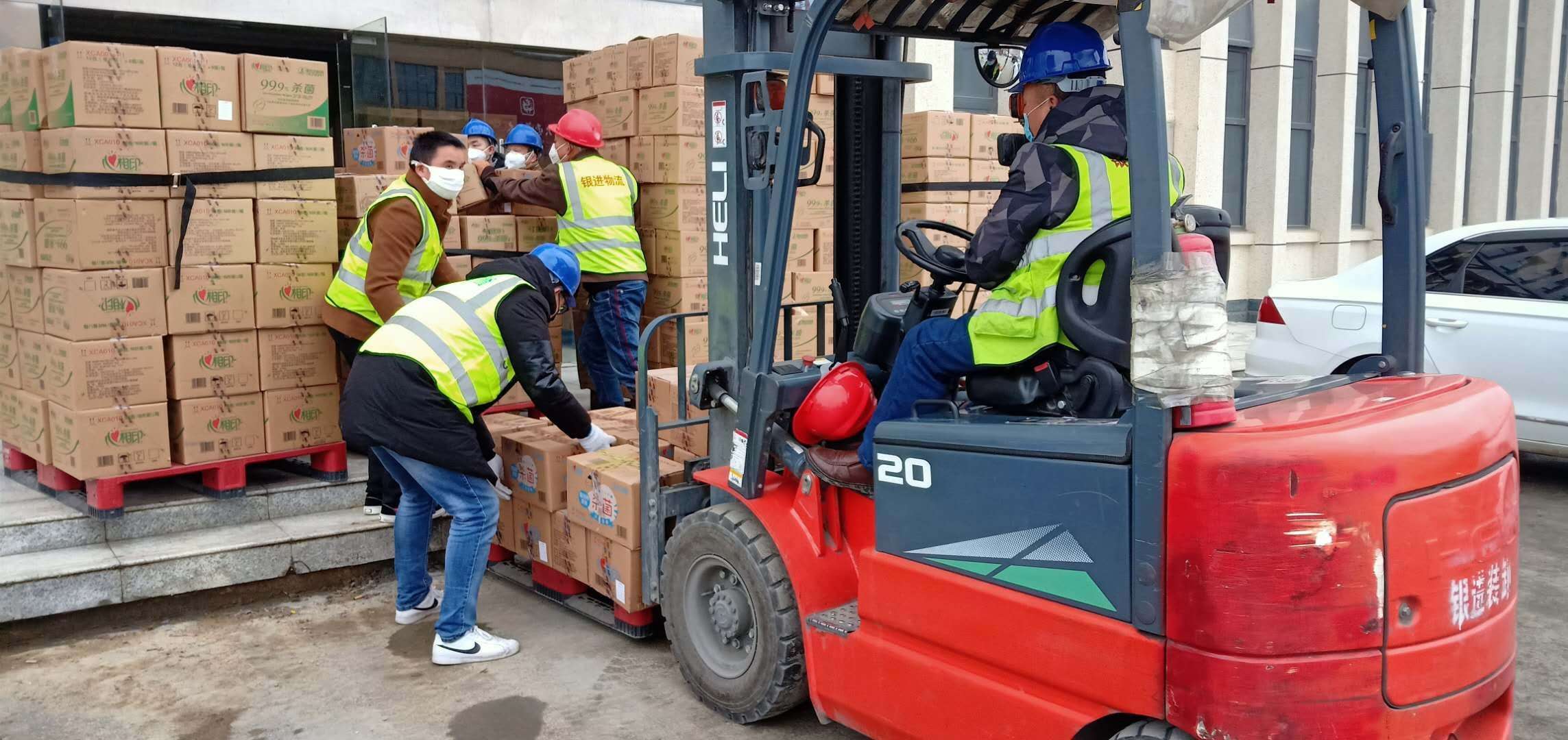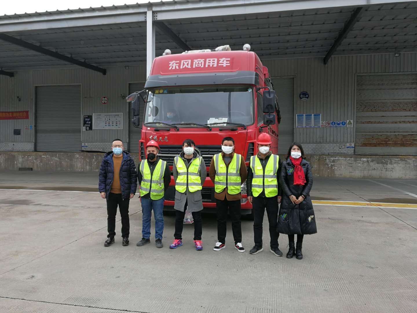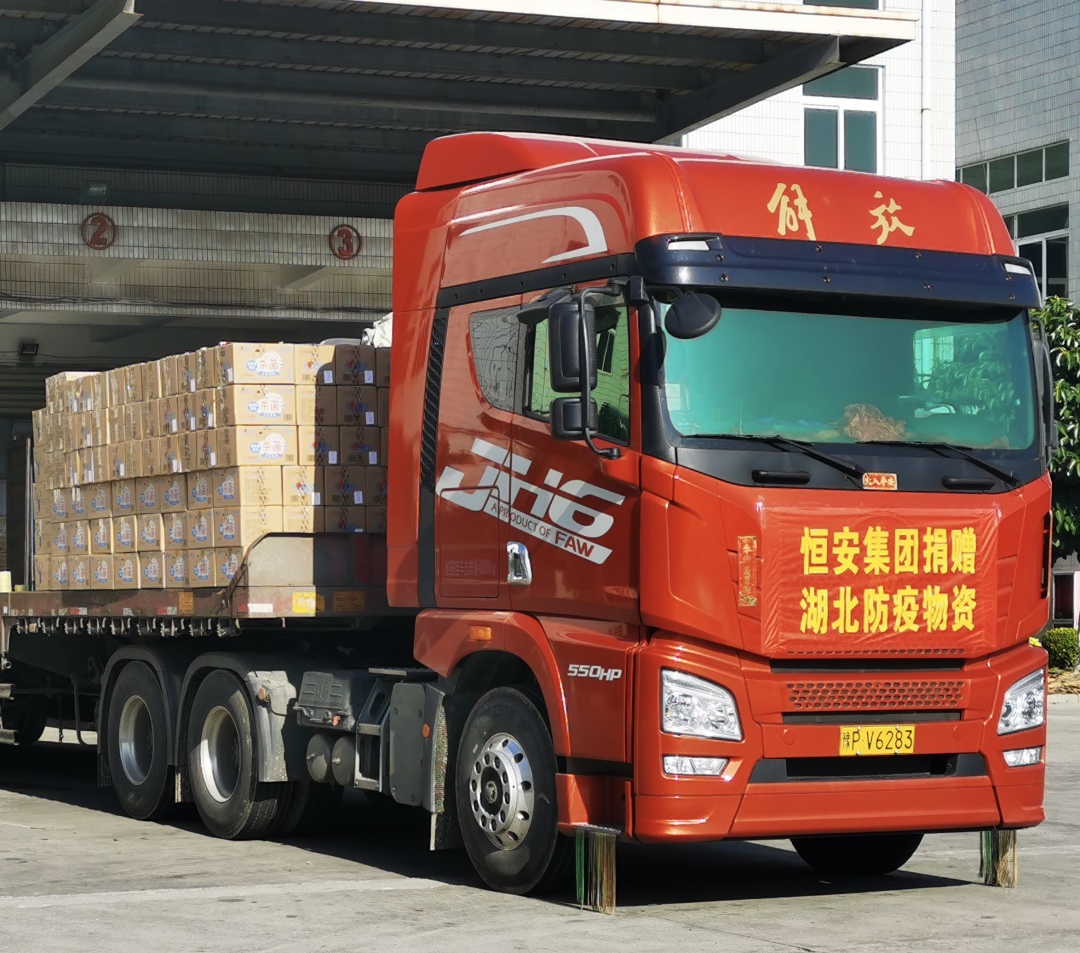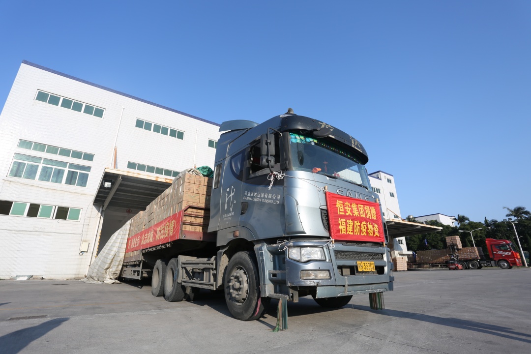 1月29日下午,满载物资的车辆陆续从恒星集团位于晋江五里工业园区的厂区发车。
